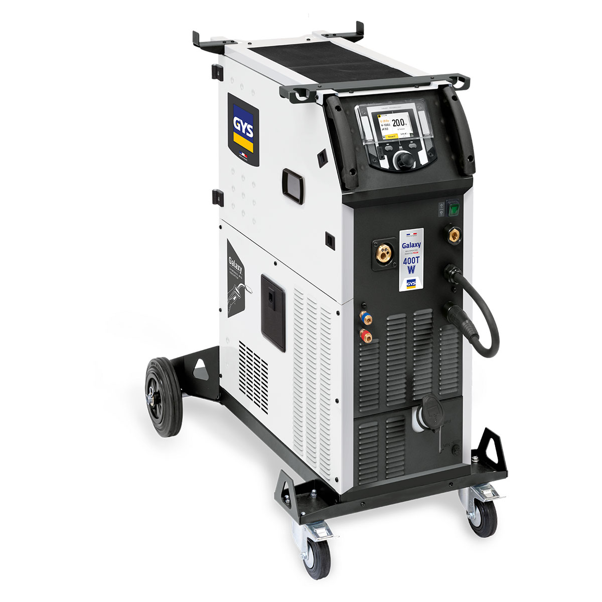 Višeprocesni izvor napajanja GALAXY 400T W, s integriranom jedinicom za hlađenje, nudi profesionalnu kontrolu svih procesa MIG/MAG, TIG i MMA zavarivanja. Njegov MIG/MAG pulsni način rada pruža ultra-preciznu kontrolu energije zavarivanja, kako bi se smanjila bilo kakva deformacija obratka. Pulsne sinergije povećavaju brzine zavarivanja i smanjuju prskanje, dok također poboljšavaju estetiku zavarenog spoja. Izvrstan za zavarivanje tankog aluminija i nehrđajućeg čelika, GALAXY 400T W je moderno radioničko rješenje za glatke varove bez dodirivanja.
