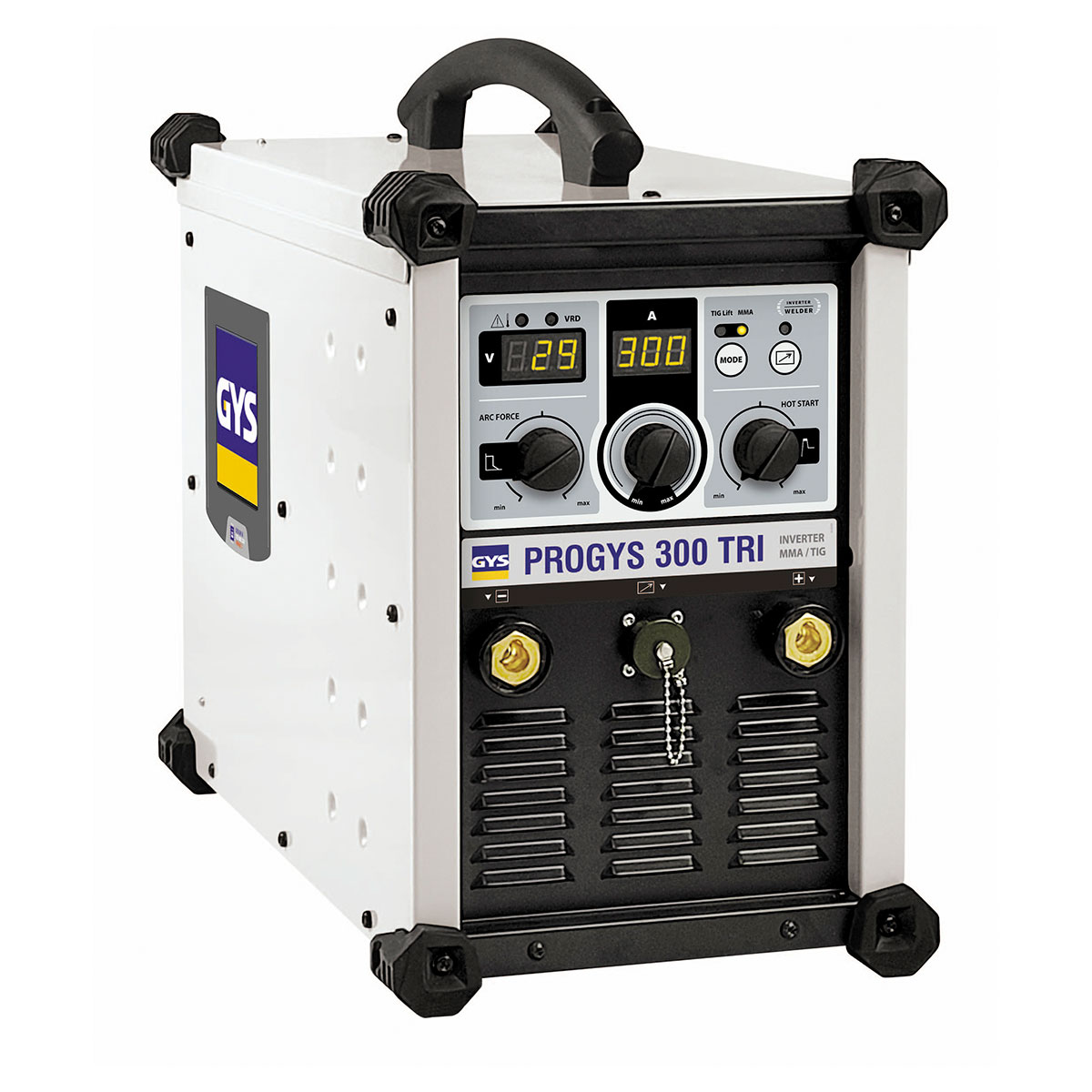 inverterskom tehnologijom, PROGYS 300 TRI je 3-fazni MMA (SMAW) / TIG (GTAW) izvor napajanja za zavarivanje s iznimnim performansama zavarivanja. Uz naprednu elektroniku, ovaj proizvod jamči maksimalnu produktivnost, čak i u teškim uvjetima. Njegov sklopivi uređaj za smanjenje napona (VRD) štiti zavarivača u opasnim područjima (rudnici, kemijska i petrokemijska postrojenja, brodogradilišta, itd.).
